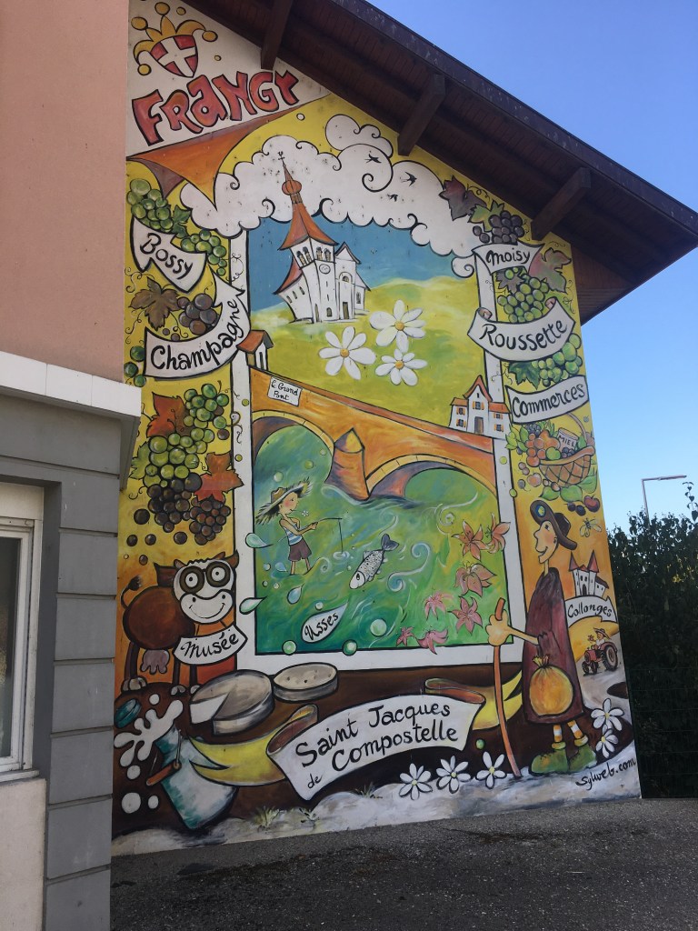 By 7.30am I was off on my merry way, back down to Chaumont (part one), and on to Frangy, a town (complete with shop!) around 3km away. According to the signs, I would take me fifty minutes. Thirty minutes had me nearing the town, down a relatively steep gravel road. I hadn’t seen anyone else for hours, so imagine my surprise when I hear a voice to my left. It’s French, so I don’t understand it, but I definitely hear something! I pause, listen. The crunch of gravel starts to sound like people when you walk long enough, and on more than one occasion I’ve assumed I was with someone when it was just me. Looking around and seeing nothing, hearing nothing, I took another few steps. There it was again!