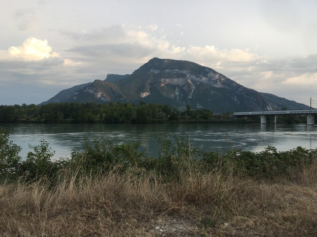 Awesome. Turning right, away from the asphalt into the fields, I followed the shells until they led me back to the Rhône. Maybe I could forgive them, just this once. The river to my right, rows and rows of grapes and apple trees to my left, the rain began again. As I wound around and around and around, Yenne started to stretch out into the impossible. My rucksack felt like it weighed a million tonnes, and no readjustments would help. I was at the end of my limits – I should have taken a break earlier.