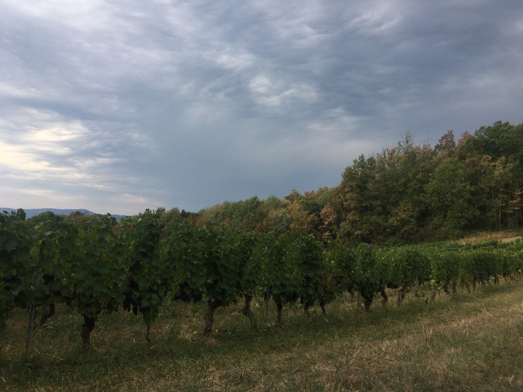 The path out of Chanez is long, and winds through towns which are more just scattered collections of a couple houses chucked together, occasionally with a water fountain. It leads up, up, up onto the mountain, then flattens to reveal a brick home in the midst of an immense vineyard. It was here, on the outskirts, that I paused for breakfast. I took off my shoes, laid back against my pack and watched the storm roll in. (The four French and two Germans passed me here, laughing at my long breaks).
