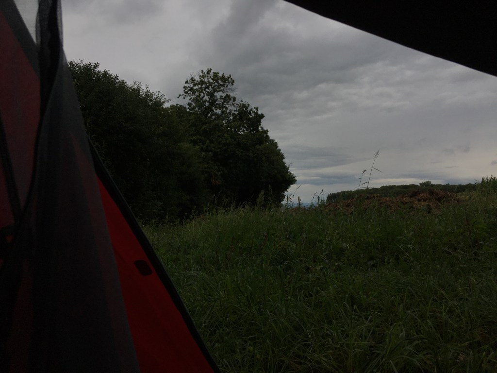 After near continuous rain for a half hour, it abates as I arrive in a field – not perfect by any means, visible from the motorbike/walking trail, but enough for tonight. I set up as the drizzle begins, and as I finally get everything inside and brace for impact (!!!!!!!); nothing happens. The rain clouds pass over, leaving my hill intact. Fuck me. I could’ve made it to Le Pin! Even so, I stay put. It’s comfortable here, and there’s still a chance of rain yet.