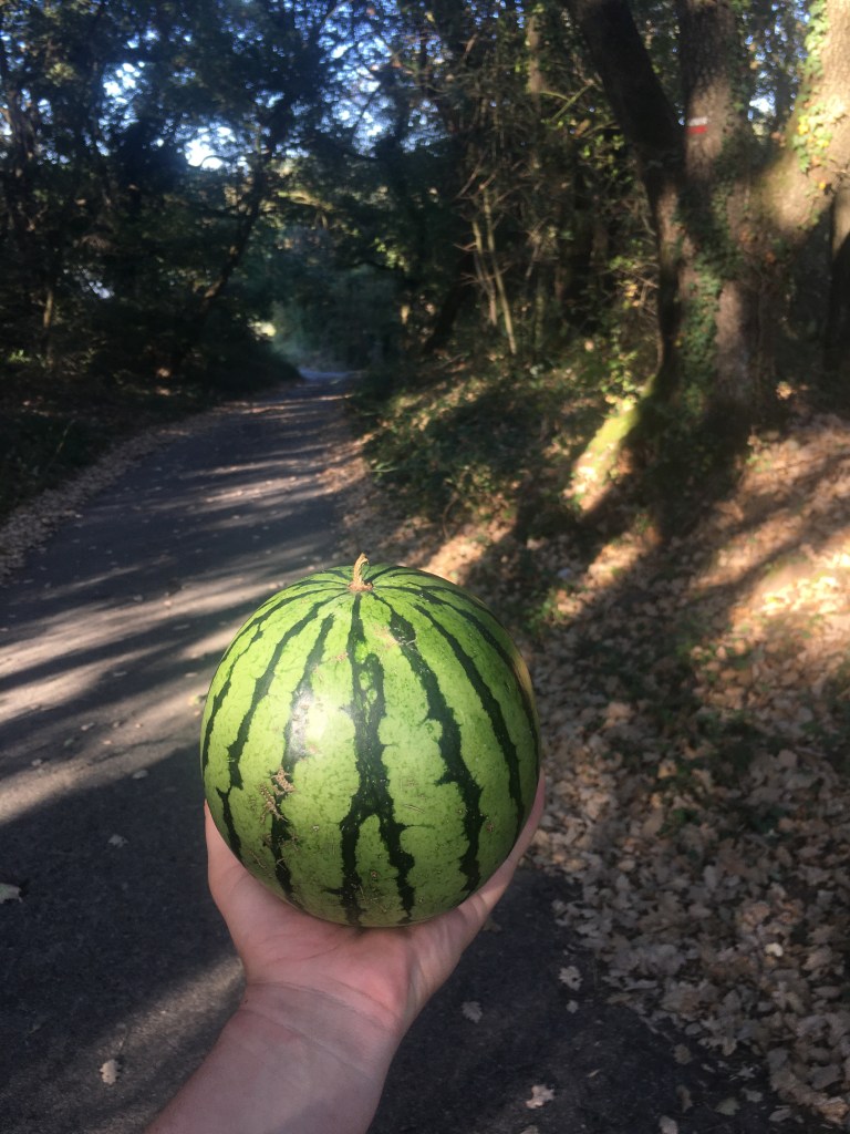 I still needed a bathroom, and I was putting my faith in the way to give me one soon so I didn’t have to shit in a field. After repacking everything except the watermelon, I was ready to set off again. Now I only had one problem : where could I put it? It was small, sure, but it was still spherical – the absolute worst shape to ever try and pack ever. There was no space anywhere – I’d have to carry it. Goddamn.