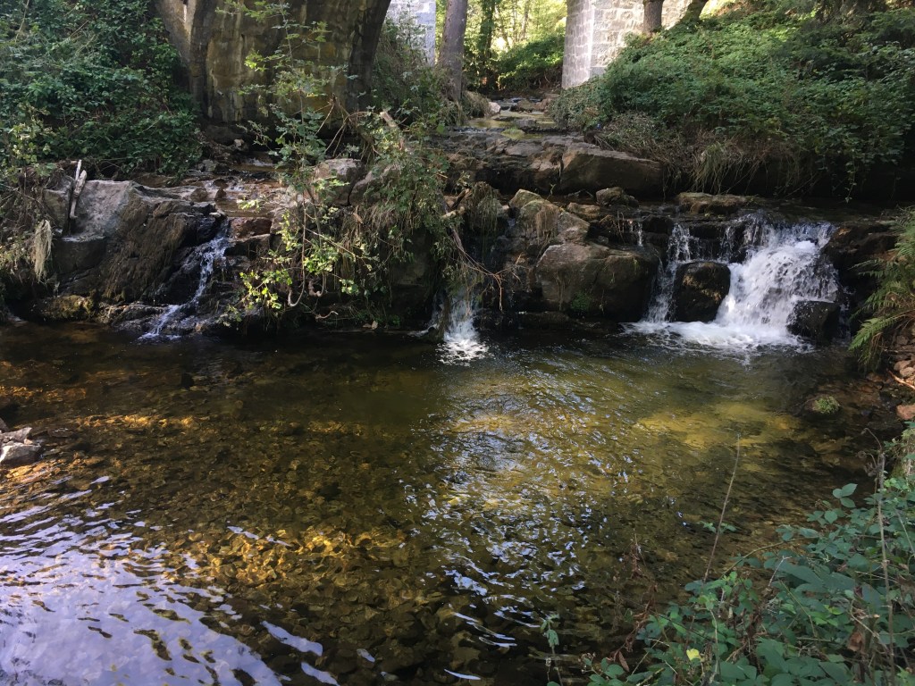 It was rocky going, and back into the woods for a bit. Once I cleared them though, it was stunning. Sunlight dappling (I fucking love that word sorry if you’re sick of it i will Never stop using it) through the trees, lighting on two small cobble bridges. Just my luck! I leant over the edge, expecting the usual stream, and felt my entire body freeze.