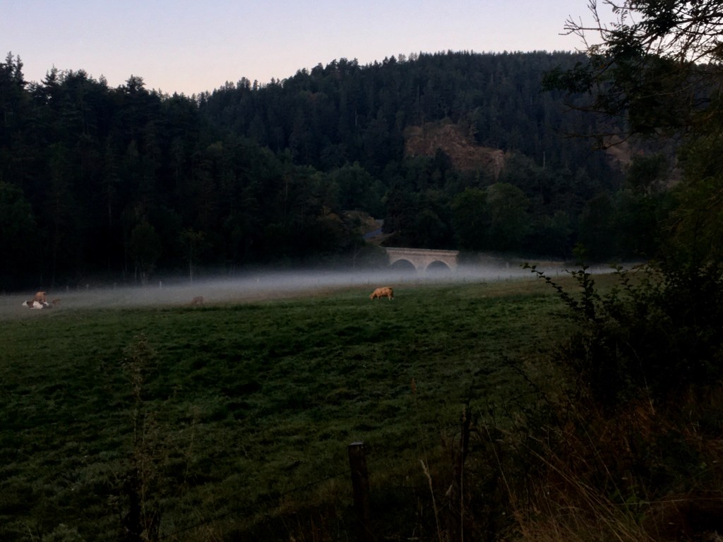 It was a wicked sunrise, and I got to watch all the stages. The first twinges of blue, covering up the stars, lighting up the ground as I split from the road back into rocky paths – no more missed trail markers :] The fog was thick on the ground, and every so often I could see the cows lumbering through. Eerie old beasts, but sweethearts. Then the bridge came into view, and the first houses.