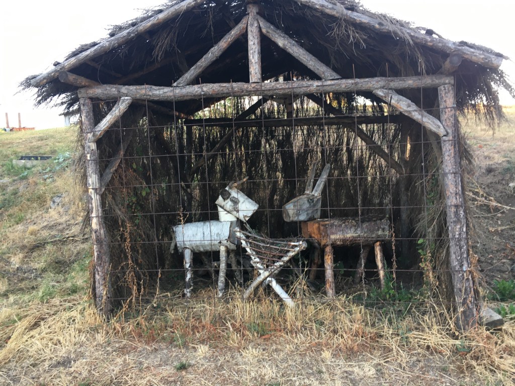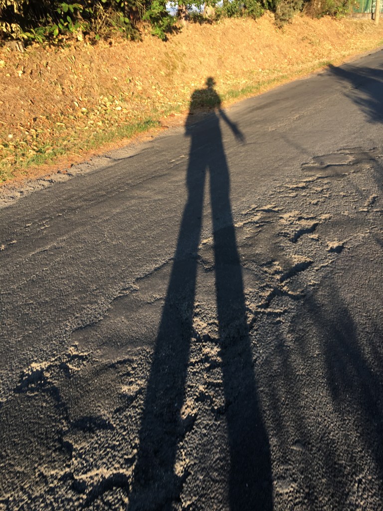 The top of the climb will find you overlooking Marnhac, and the surrounding villages, a mishmash of larger towns. St-Germain-Laprade to the left,,,,, other ones (??) to the right. The sun is up now, and it’s right about 8.00am. But there’s no benches yet, so we’ll press on. After a little more uphill downhill, you’ll find one, overlooking the valley below, and, in the not-so-far distance, Montjoie, the last hill to climb before Le Puy.