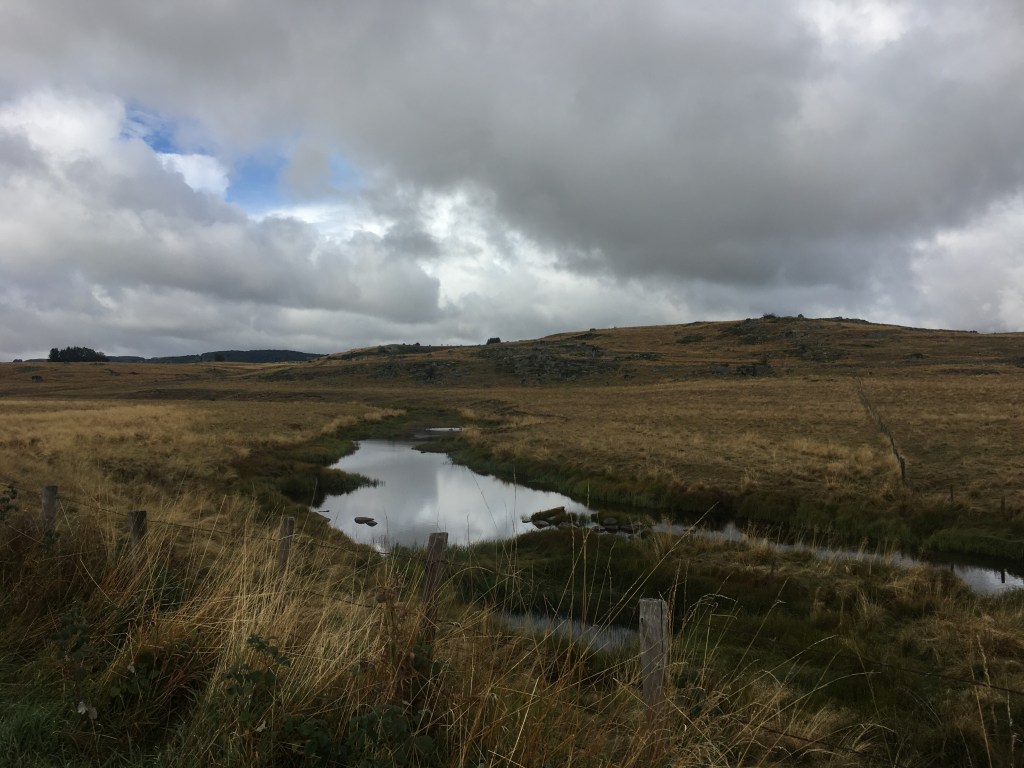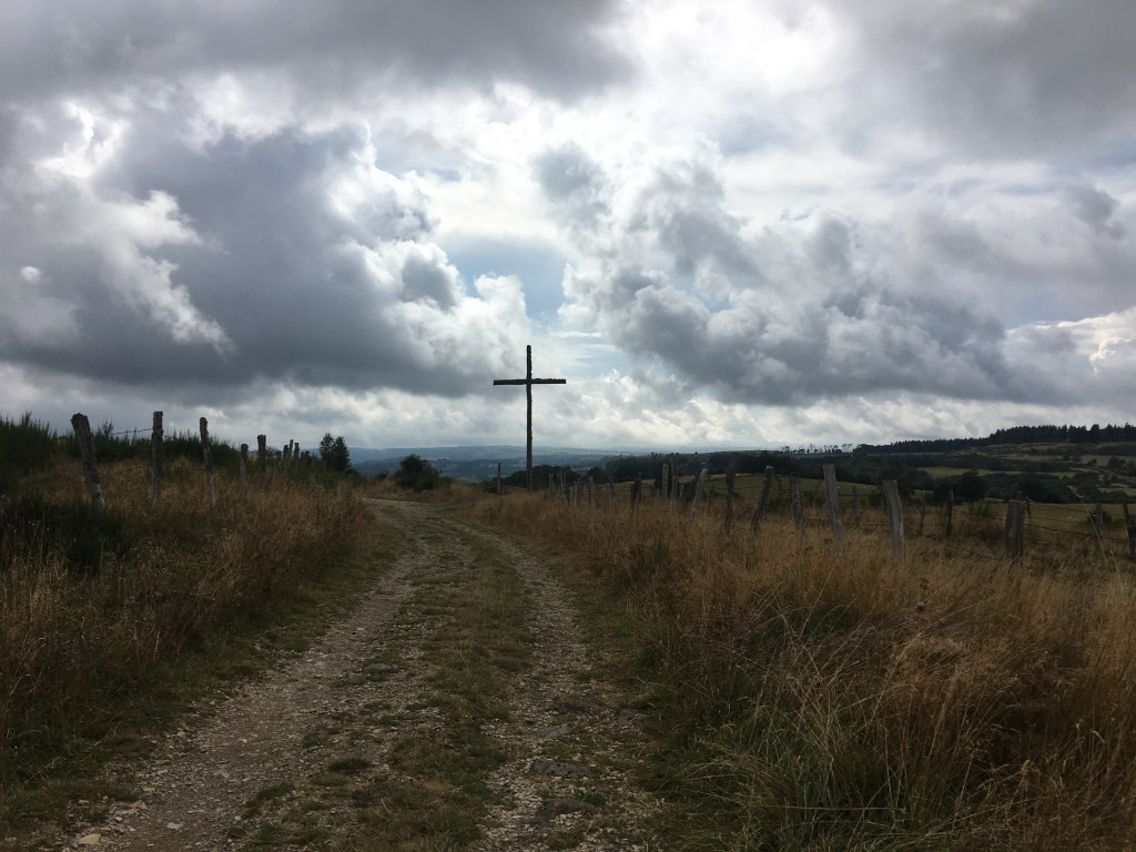 Low stone fences, the same sandy cows. A wooden cross or two on the horizon. Briefly, you’ll follow the side of a forest, see a farm peeking through the cracks, then you’ll peel away again, back to the land of golden waves and cattle gates. After a (very) long stretch of cow shit and muddy stones, you’ll reach your final grate; then a spike. You’re walking to the highest point on the entire Podiensis, and you don’t even know it. It’s nothing like the climbs of the Gebennensis – this time, it’s just another hill. And then you’re at the top, and you can see Aubrac, and this is the highest you’ll get for a month – 1364m above sea level.