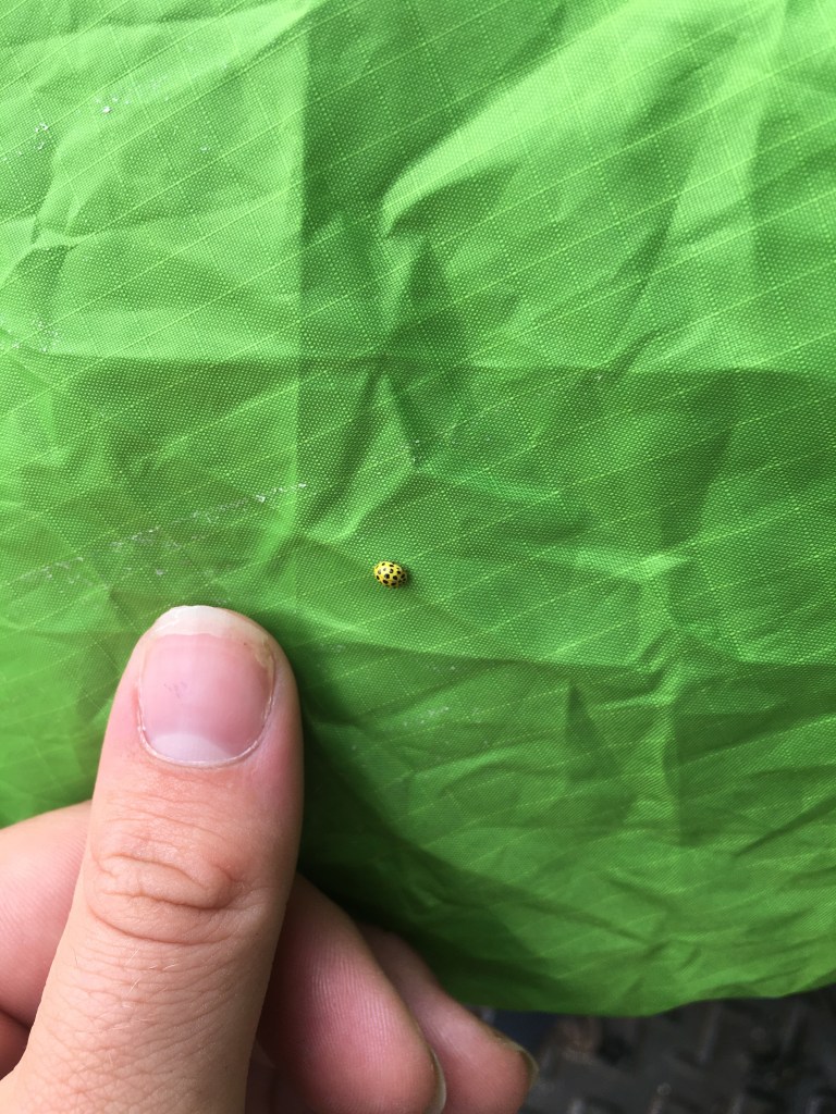 Here is where I finally take my first break, 20km into the day, and find the tiniest ladybug I’ve ever seen in my life. Oh, and a bit of free advice? If you notice, say, 6km into your walk that your socks are sopping because you walked through a puddle that was just a bit too deep for your Gortex, take the fuckers off. When I peeled them off afor the first time here, they were capital g Gross.