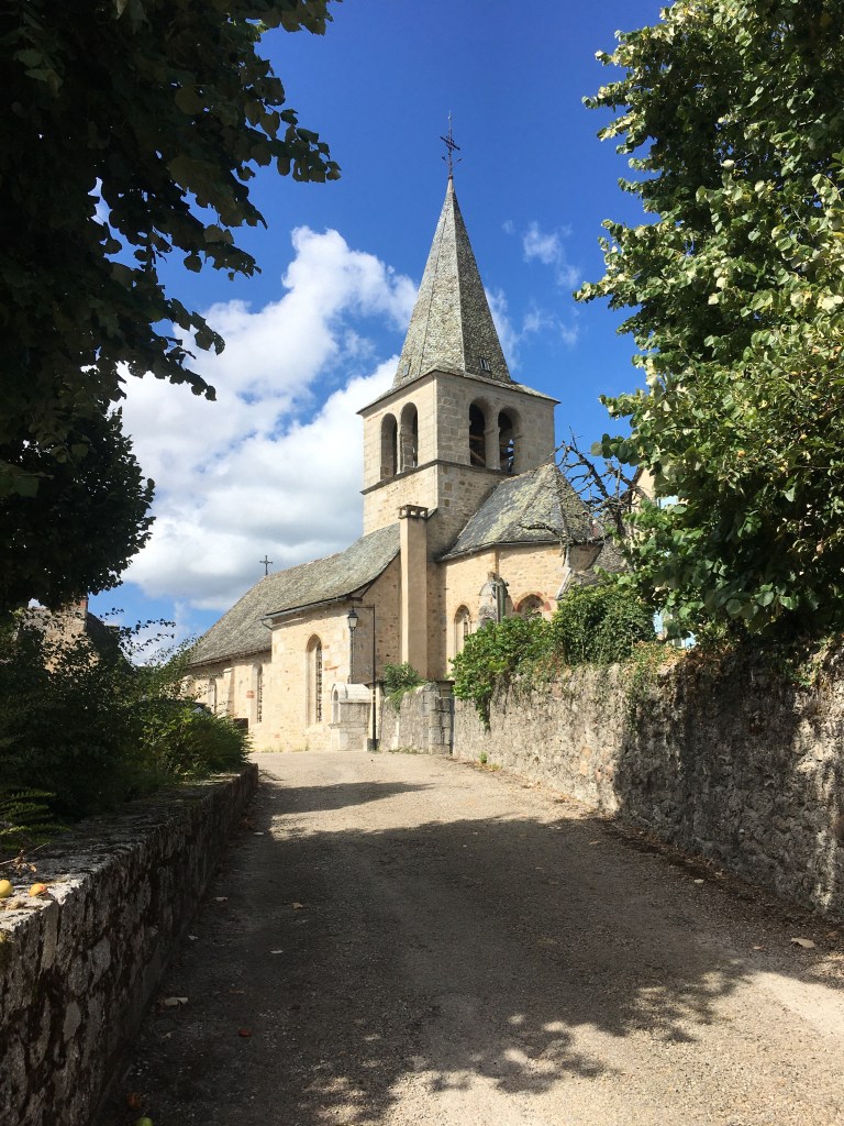 I have a bit of a last minute wash of a pair of socks and a pair of undies, hang them off my pack, then rinse (literally) and repeat with my towel. Now all I need is sunlight, please. On my way out, I notice a tiny épicerie tucked away, and visit – there’s nothing that particularly appeals though, so I move along, albeit slowly. It’s a shorter day than the last few today, just over 20km, so there’s no need to rush. Plus, I’ve developed a fun new (English) pain; the top of my right foot absolutely screams whenever it touches my boot. Rightio. Loosened (too much gravel for bare feet today, even with a shorter day), I carry on into the centre of town, where I see a familiar haircut craning up at the church.