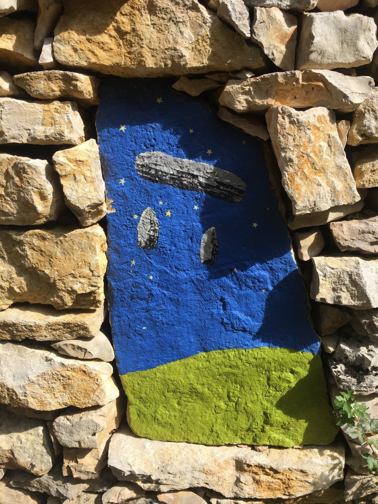 But, for me and the others in the blob for today, it’s clear skies and heat. Very welcome – it’s been a chilly few days. In the distance ahead of me, I see a smattering of pilgrims in full white with what seem to be,, robes (?) or some kind of fabric flowing out behind them, which I am very excited to catch up with because: huh?? I pass a few people, get passed by others. The blob reconfigures, but by the time we reach Faycelles, it’s makeup hasn’t changed significantly.